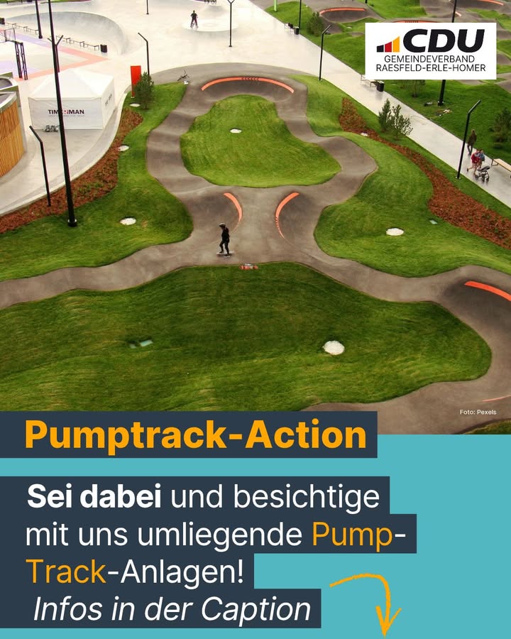 🚴♀️ Pumptrack-Action für Kids & Teens! 🛴Du hast Lust auf Fun mit deinem Bike oder Scooter? Dann komm mit uns auf Tour!Wir, die CDU Raesfeld laden gemeinsam mit der SPD Raesfeld 15 Kinder und Jugendliche (8?16 Jahre) ein, zwei Pumptrack-Anlagen zu besichtigen ? und natürlich auszuprobieren!✅ Wann?📅 03.01.2026⏰ Um 09:40 Uhr auf dem Büroparkplatz an der Friedholt 1 in Erle⏰ Um 10:00 Uhr am Raesfelder Sportplatz ✅ Was brauchst du?✔ Dein Roller oder Bike✔ Helm ist Pflicht!Wir wollen dein Feedback: Wie soll eine Pumptrack-Anlage in Raesfeld aussehen?Sei dabei und gestalte mit! 💡👉 Anmeldung: Melde dich bei deinen Eltern und schickt uns eine Nachricht.Plätze sind begrenzt ? also schnell sein!Bei Rückfragen könnt ihr uns unter 0151/72001291 erreichen.