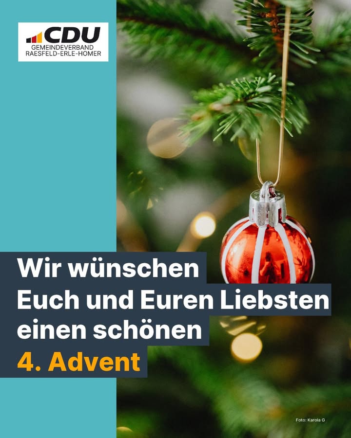 🎄✨ Frohe Weihnachten! ✨🎄Wir wünschen allen Bürgerinnen und Bürgern in Raesfeld, Erle und Homer ein besinnliches und friedliches Weihnachtsfest. Mögen die Feiertage Zeit für Ruhe, schöne Gespräche und wertvolle Momente mit Familie, Freunden und allen Liebsten schenken.Genießt die gemeinsame Zeit, bleibt gesund und kommt gut ins neue Jahr. ❤️#Weihnachten #FroheWeihnachten #Raesfeld #Erle #Homer #Gemeinschaft #BesinnlicheZeit